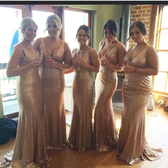 Luxury Rose Gold Sequin Bridesmaid Dresses Cheap Deep V Neck Mermaid Champagne Long Plus Size Bridesmaids Wedding Party Guests Dress Gowns Childrens
