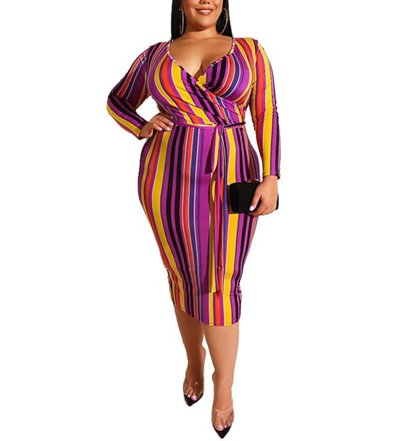 Echoine Women Plus Size Dress Stripe V Neck Long Sleeve Bodycon Midi Dress Prom Outfits With Belt