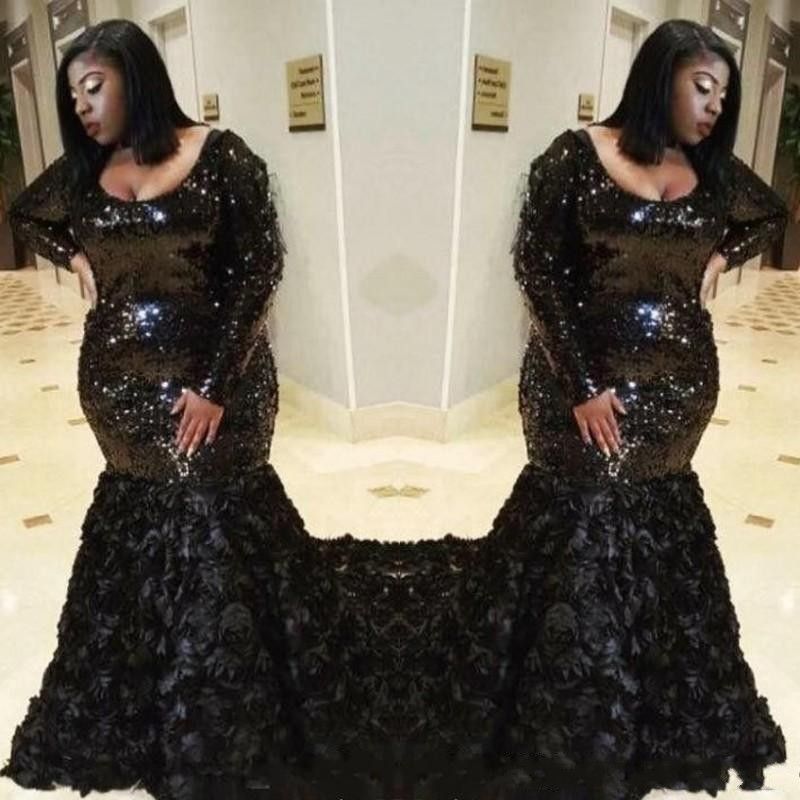 Vintage Plus Size Black Sequined Prom Dresses 2019 New 3d Rose Floral Long Sleeve Scoop Formal Mermaid Evening Dress Party Gowns