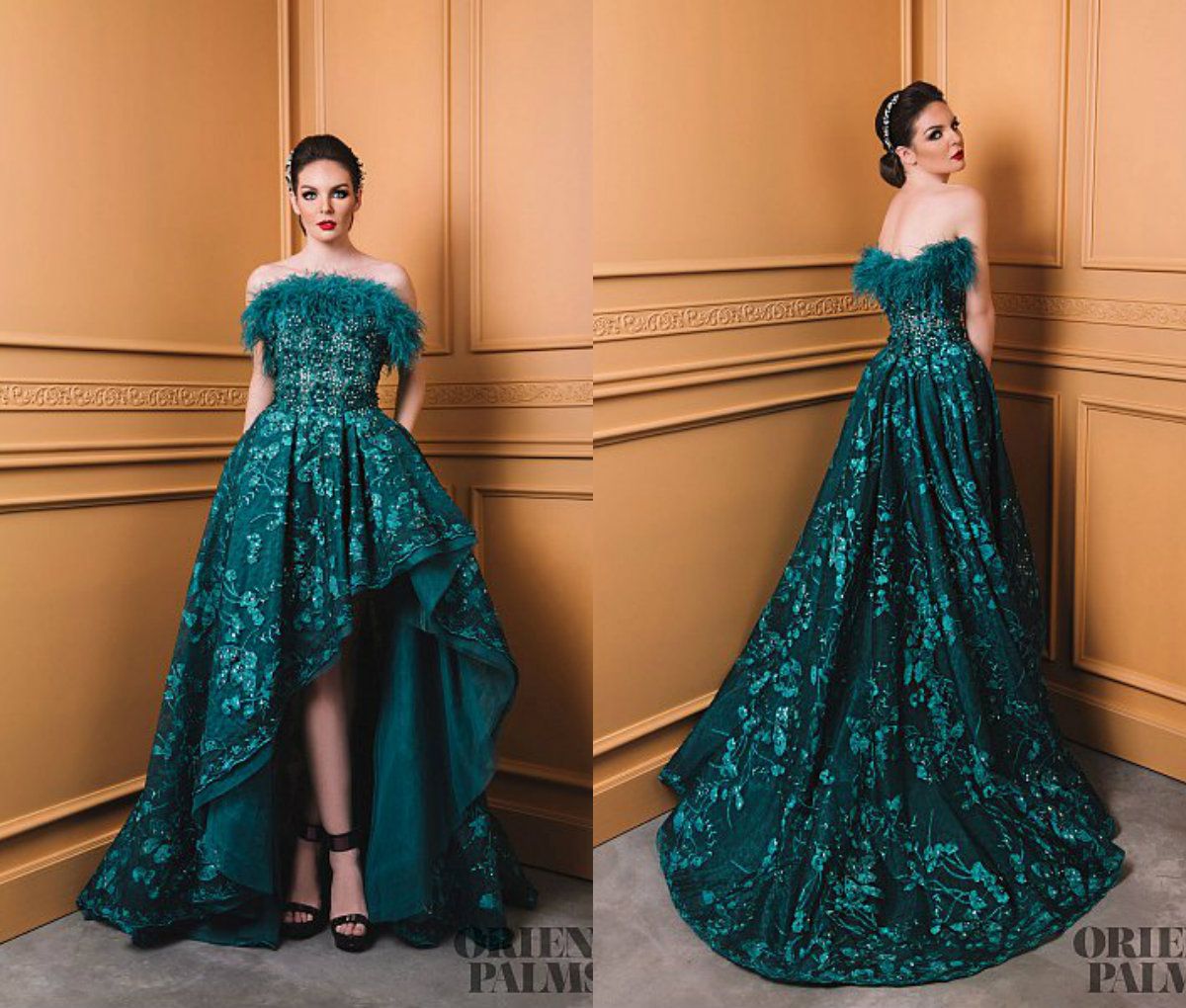 High Low Hunter Prom Dresses 2018 Lace Applqiue Sequins Luxury Feather Beaded Formal Dress Party Evening Wear Plus Size Evening Gowns
