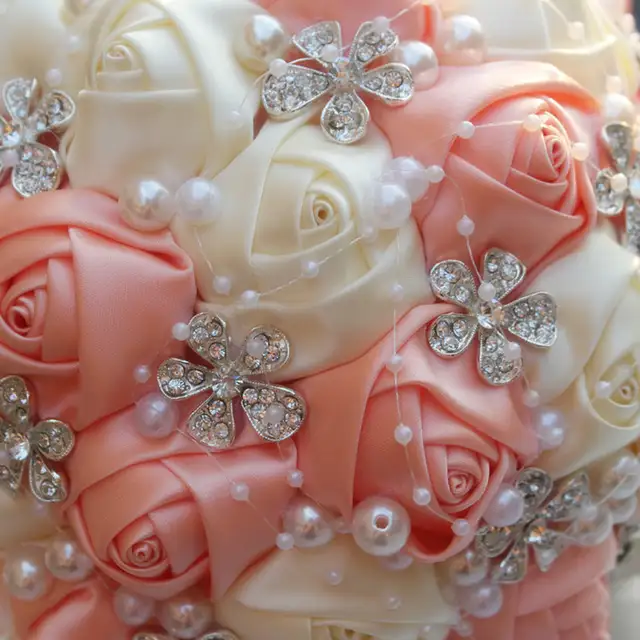 Us 14 11 48 Off Coral Pink Ivory Champagne Satin Rose Festival Stitch Bouquets Custom Ribbon Wedding Bridal Bouquet Flowers Color Option W224a 6 In