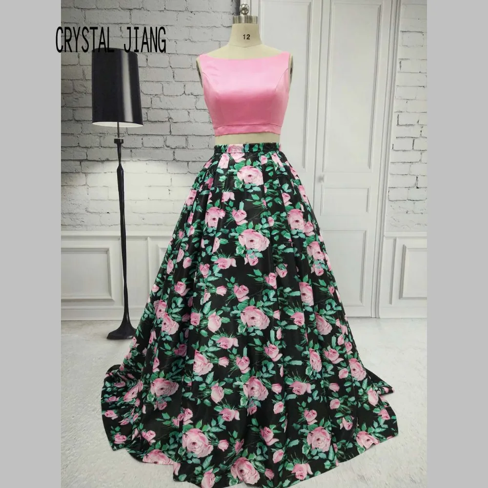 Us 98 65 12 Off Crystal Jiang Pink Floral Print Ball Gown Skirt Custom Made Pink Satin Two Pieces Fashion Cheap Evening Gowns In Evening Dresses