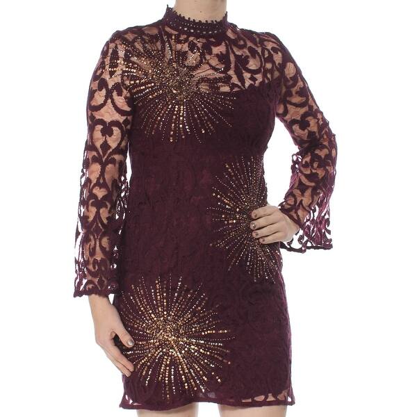 Free People Womens Maroon Sequined Lace North Star Bell Sleeve Mini Shift Party Dress Size 4